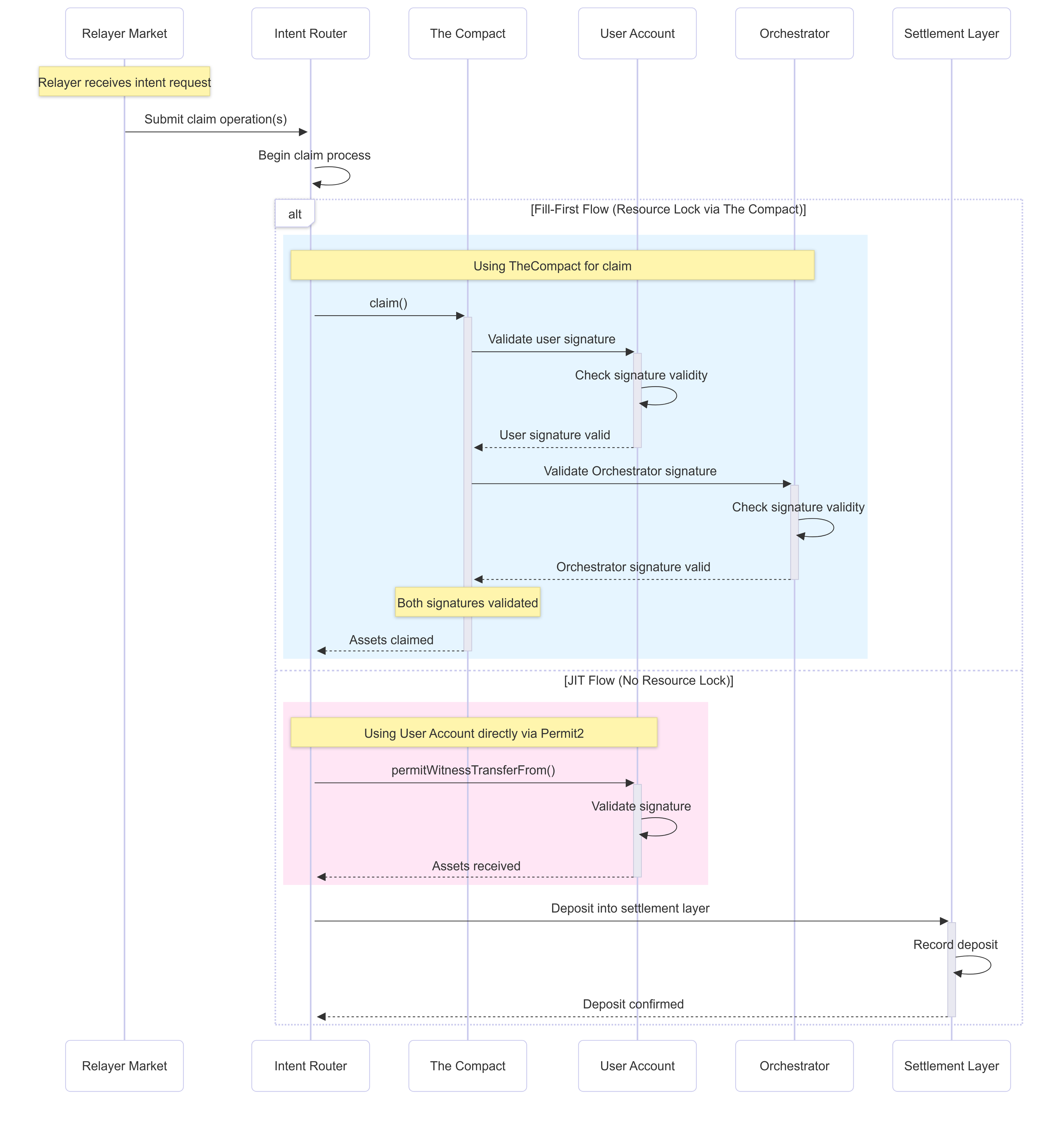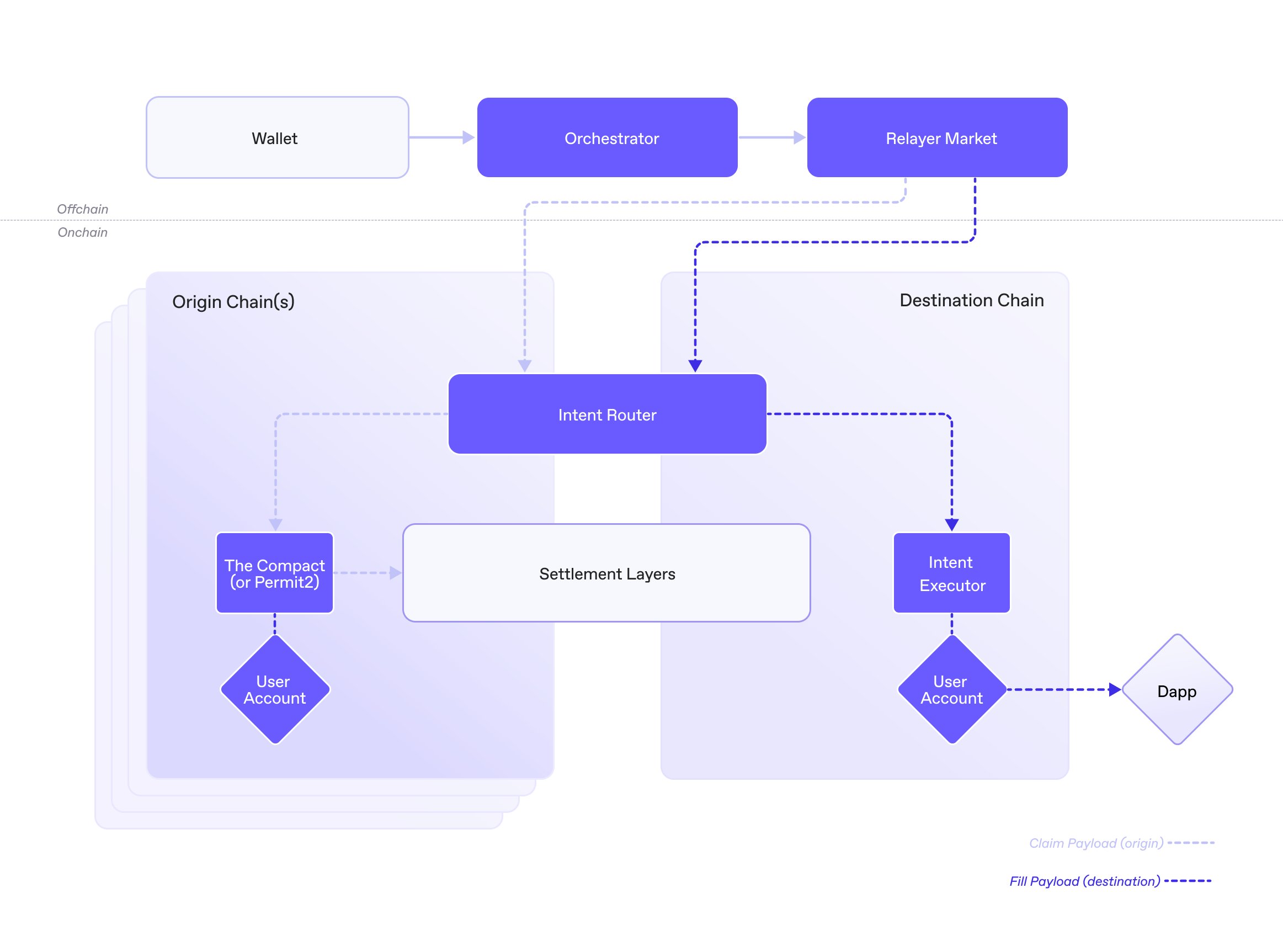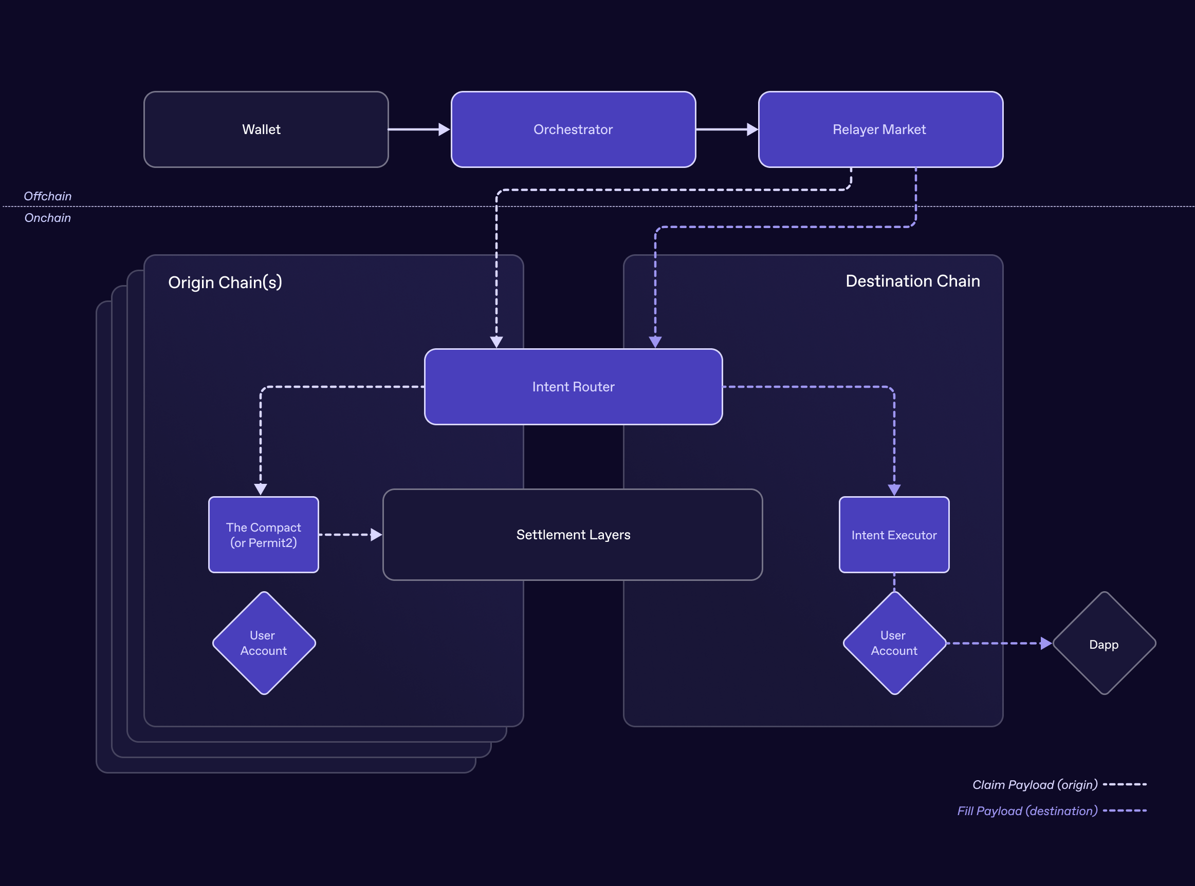 - Resource Lock (via The Compact): An onchain component that facilitates optimistic filling on the destination chain before the origin chain claims are processed, enabling faster intent execution.